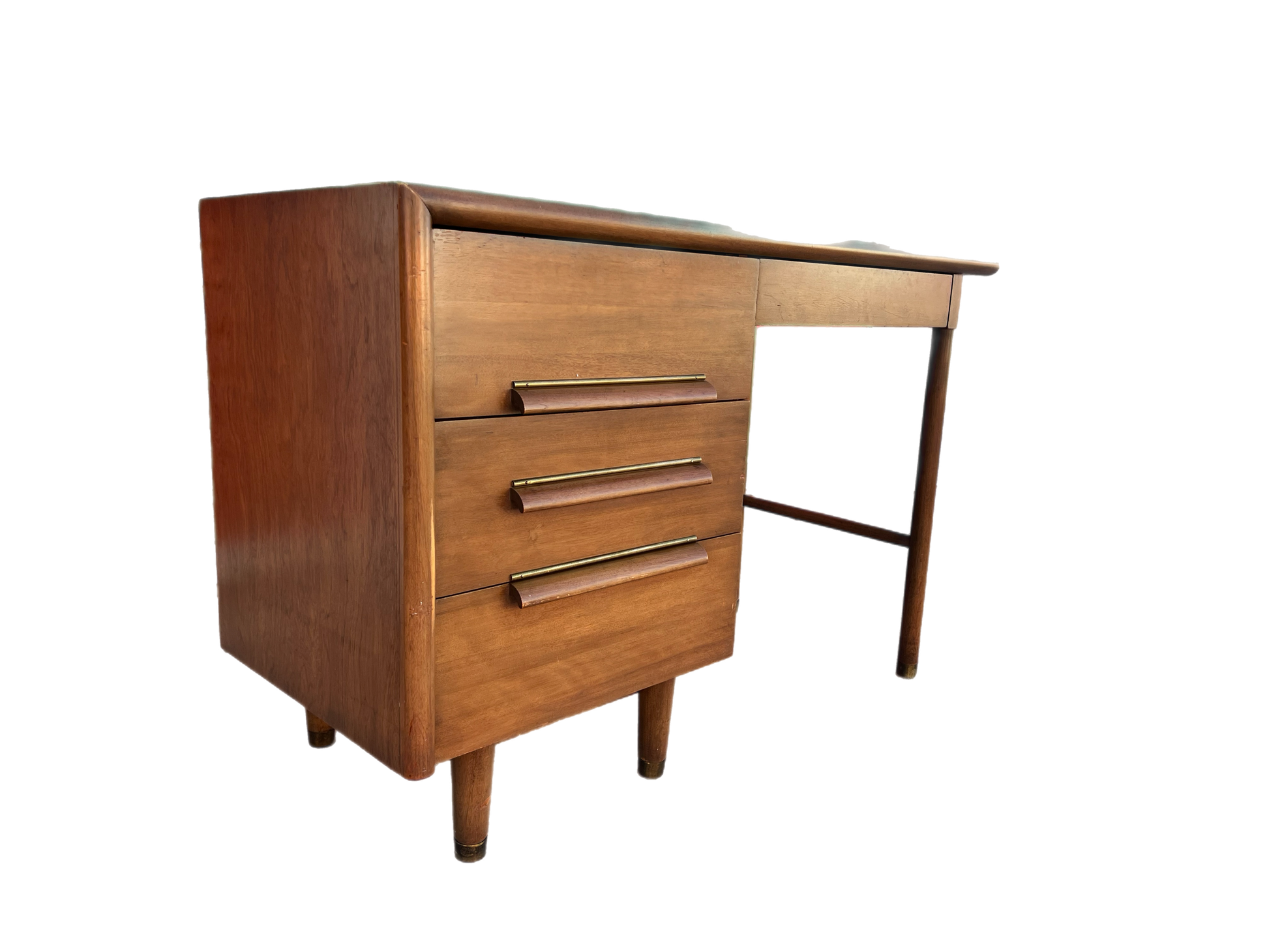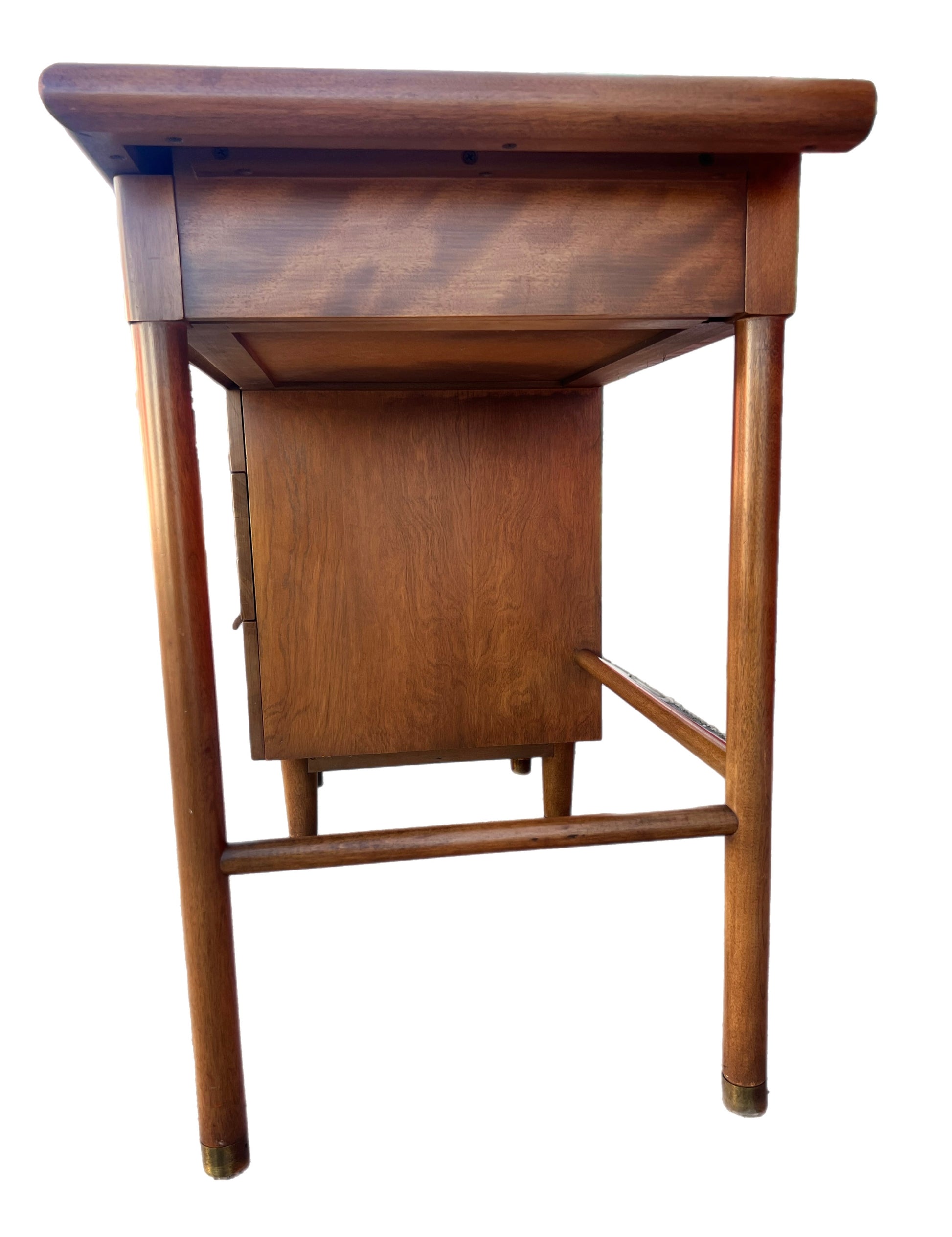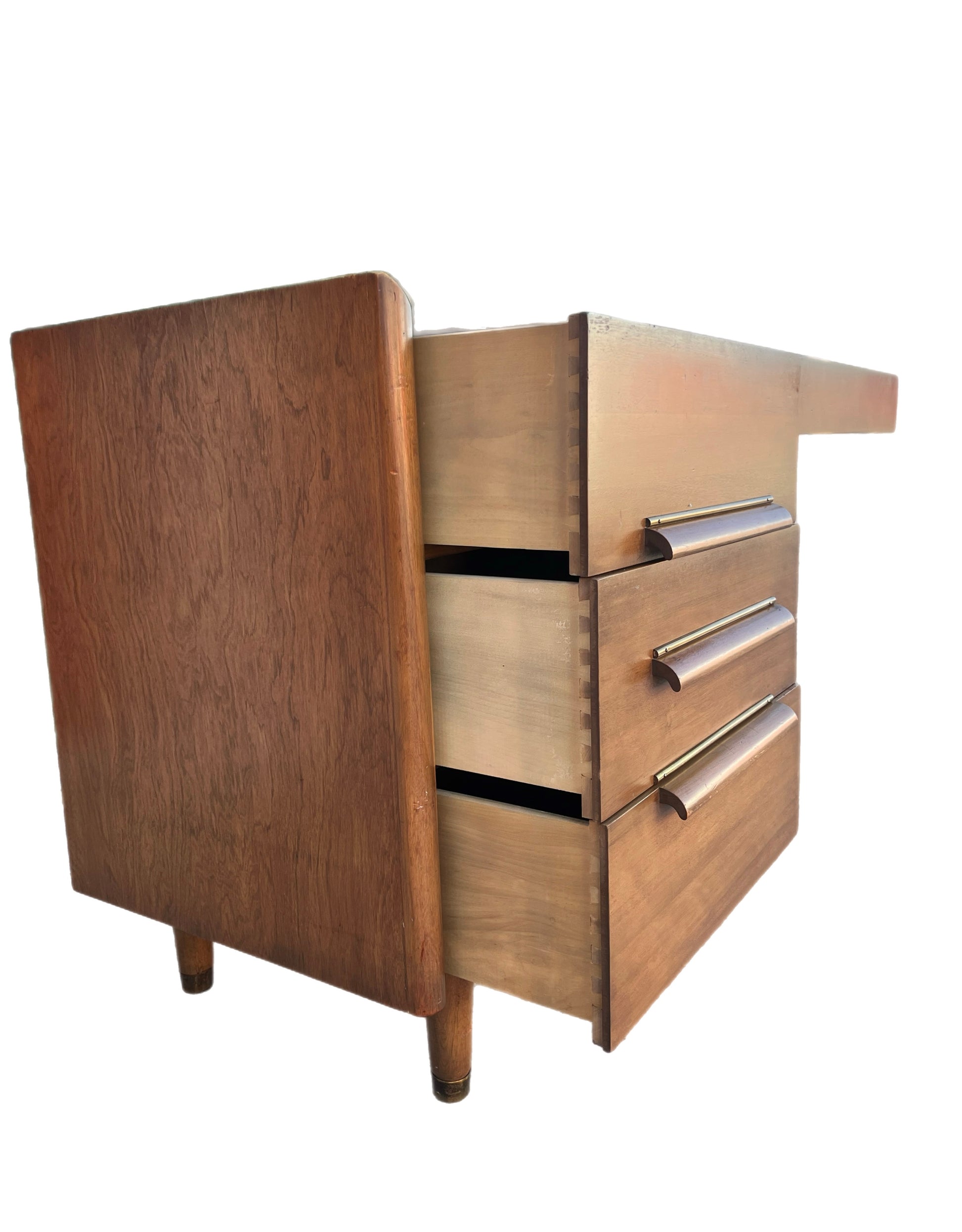 This beautifully crafted mid-century desk by the Furniture Guild of California embodies the clean lines and functional elegance of the 1950s–60s modernist movement. Constructed of warm, honey-toned wood, the desk features a streamlined silhouette with three deep drawers accented by elongated brass-trimmed pulls. The left pedestal provides generous storage, while the right side offers open leg space supported by rounded tapered legs with brass-capped feet, adding a subtle touch of sophistication.