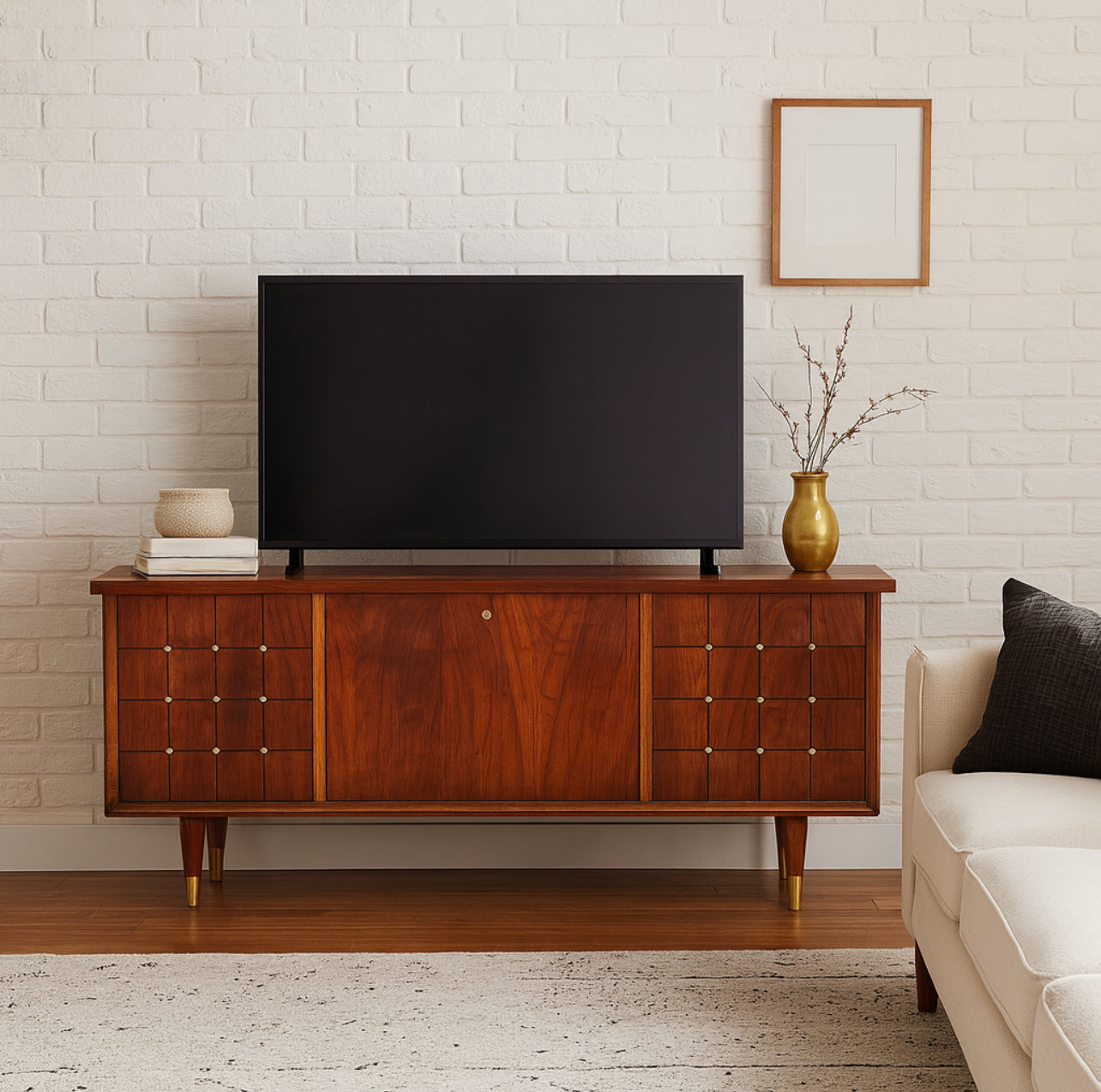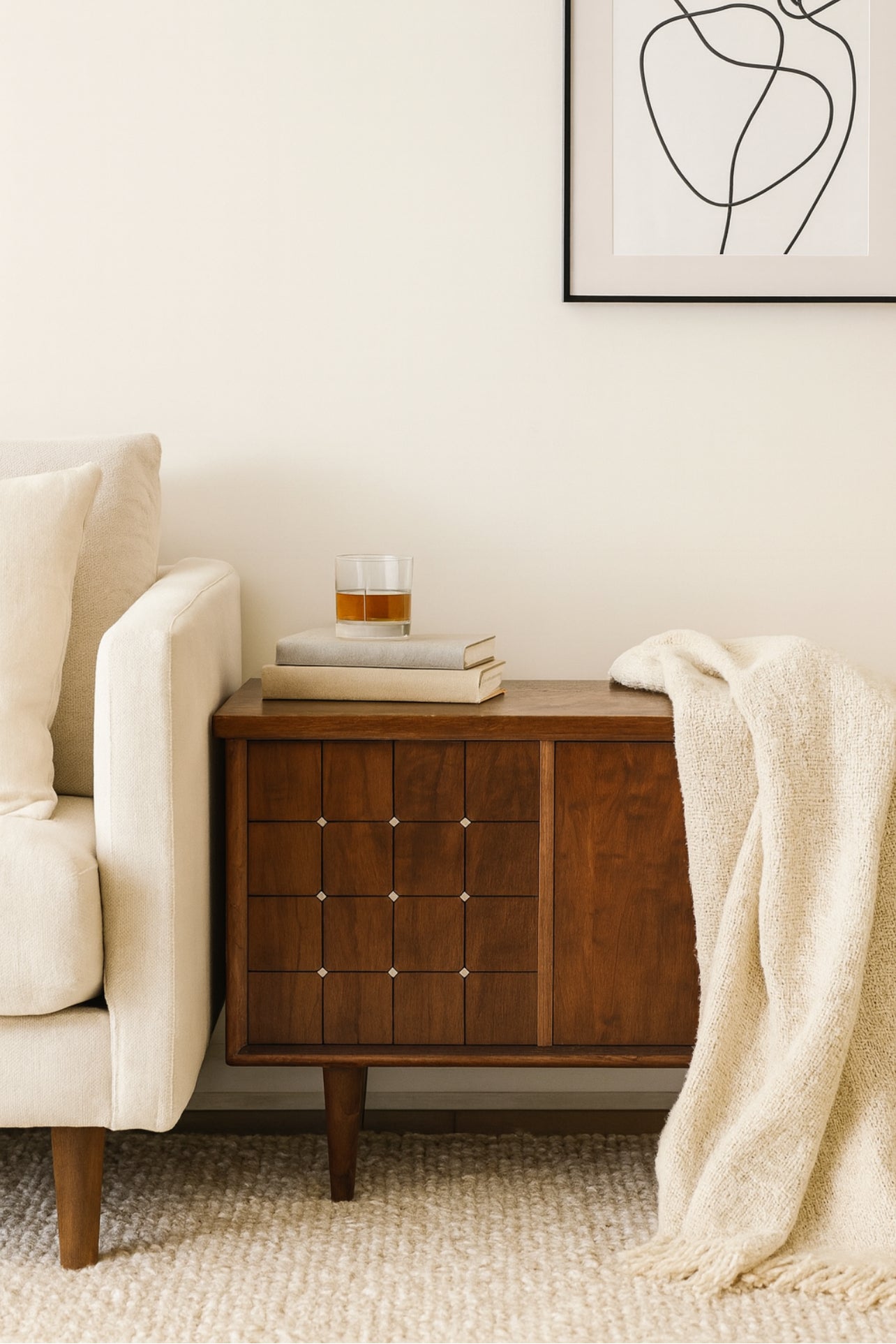 The exterior showcases Lane’s signature geometric grid design with incised squares accented by brass studs, adding both texture and subtle shine. The warm walnut finish highlights the rich wood grain, while the clean lines and tapered legs give it that iconic mid-century silhouette.
