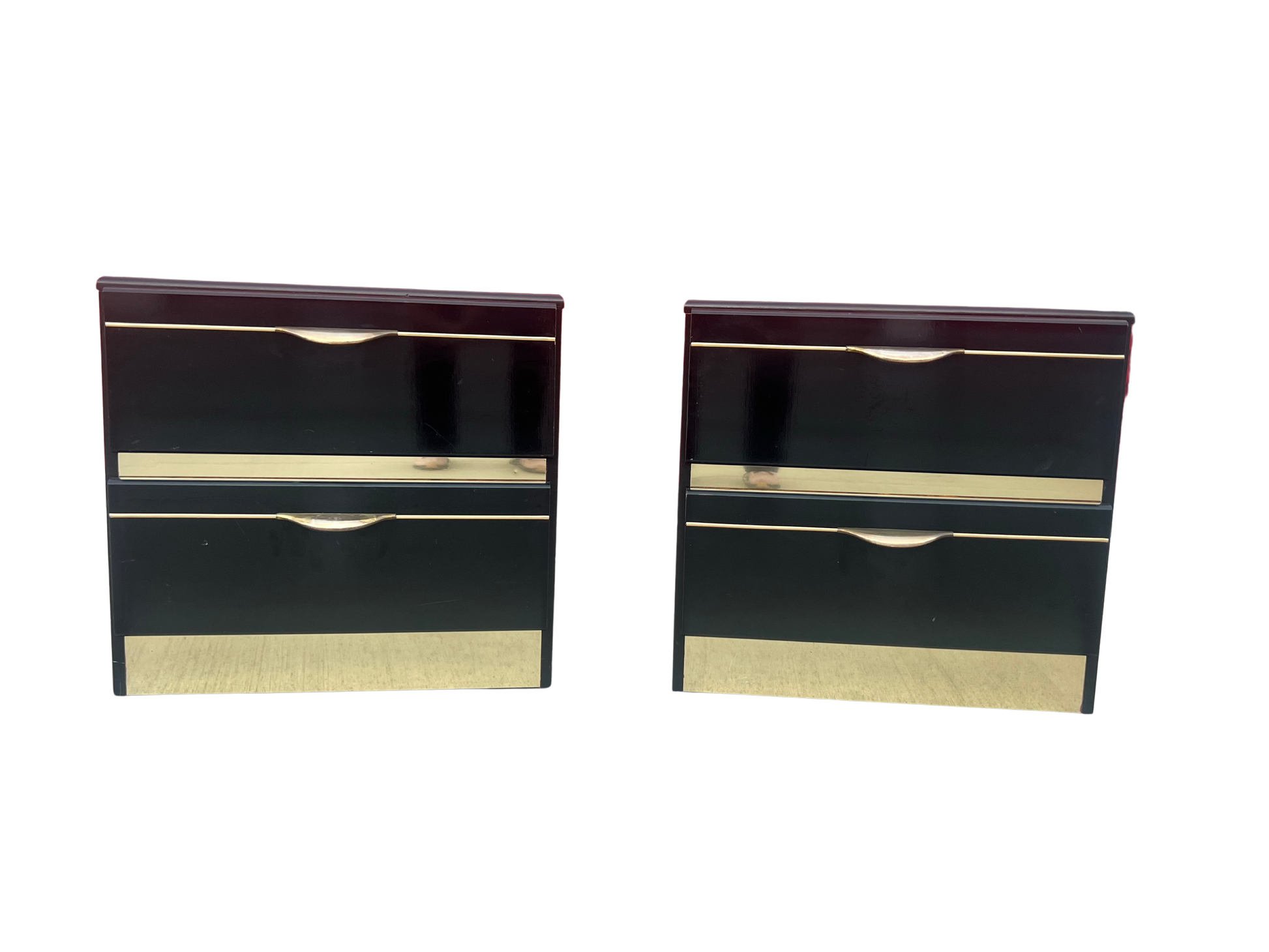 Add timeless glamour to your space with this stunning pair of vintage postmodern nightstands in glossy black lacquer with sleek gold detailing. Their bold lines and reflective finish embody Hollywood Regency style with a touch of sophisticated drama.